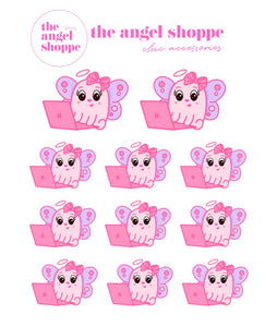 Angel on laptop (working, playing games, video chat, school work) (clear matte stickers)
