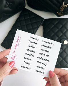 Classsic font days of the week (SHORT) stickers in black (clear matte stickers)