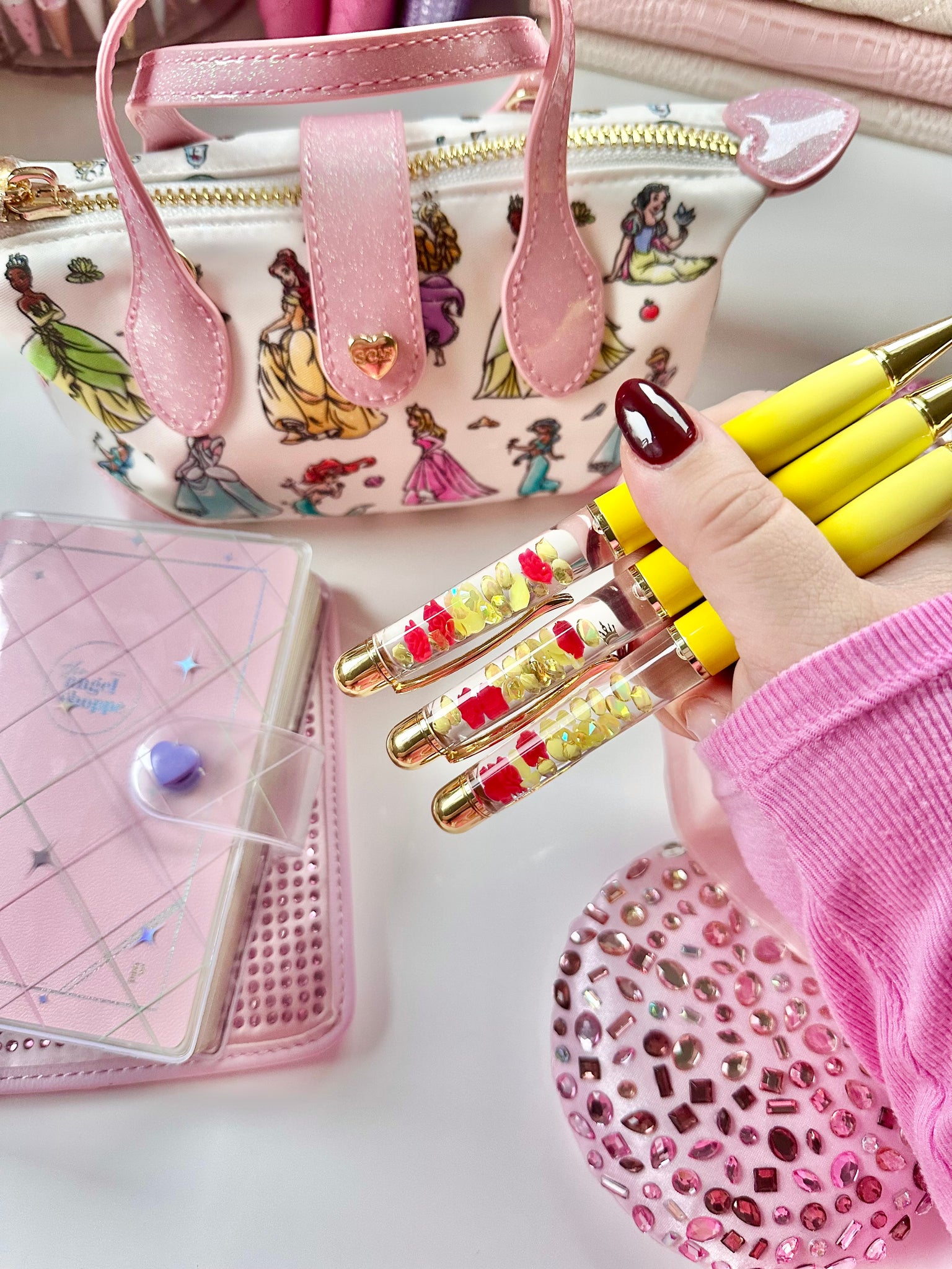- BELLE pen: This pen is for the person who wants adventure in the great wide somewhere. Who believes in herself and adores her loved one. Who loves books and loves with her whole heart. This pen has an ombre yellow barrel with gold hardware to emphasize Belle’s ballgown dress. There are floating red flowers inside to represent the red rose in the movie, little golden tiaras and yellow crystals for the perfect princess! There is a wilted rose logo on each pen. Tale as old as time 🥀.