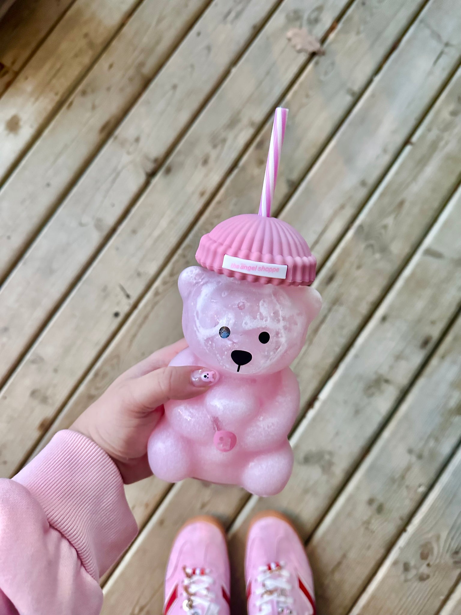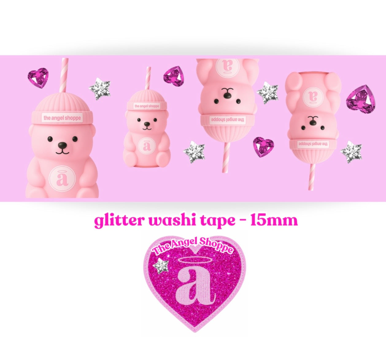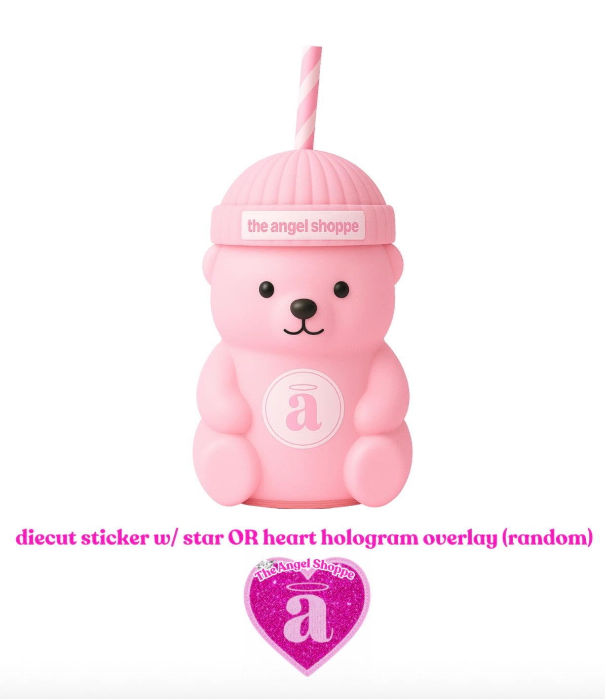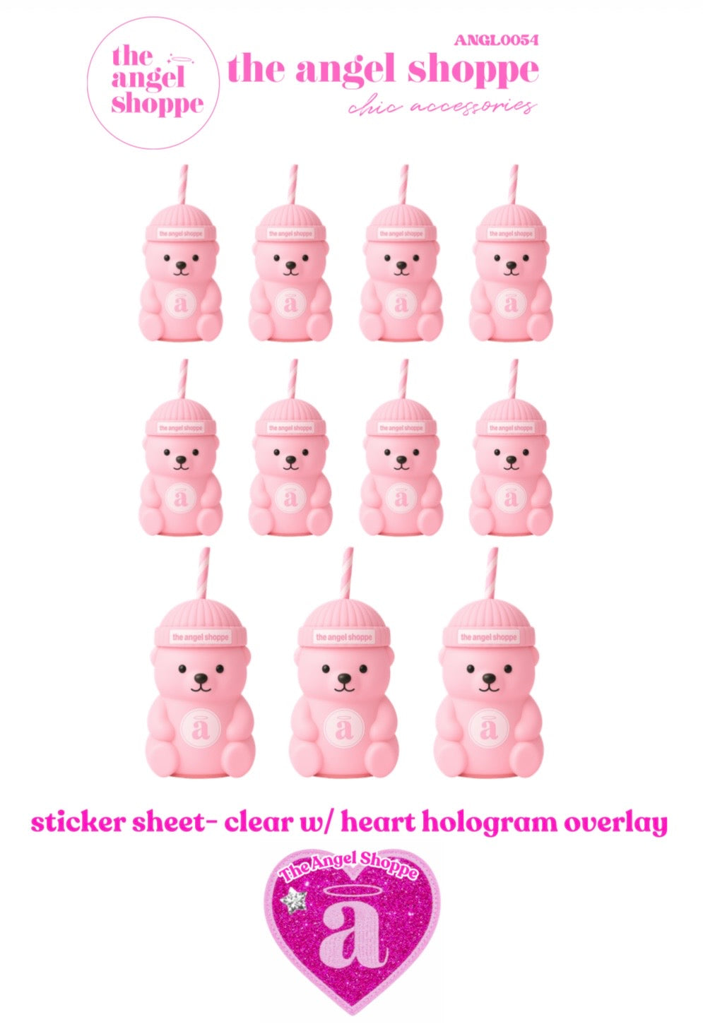 🧸 pink bearista TAS glass mug with matching pink and white striped straw - silicone hat signature “the angel shoppe” in a dusty pink. This item includes a JUMBO sticker sheet of the pink bearista glass mug. Mug dimensions- holds 20 ounces. Height 5.9 inches (not including straw) x 3 inches Wide. Our logo is on the belly glass part of the mug in a dusty pink color. Recommended to hand wash only!